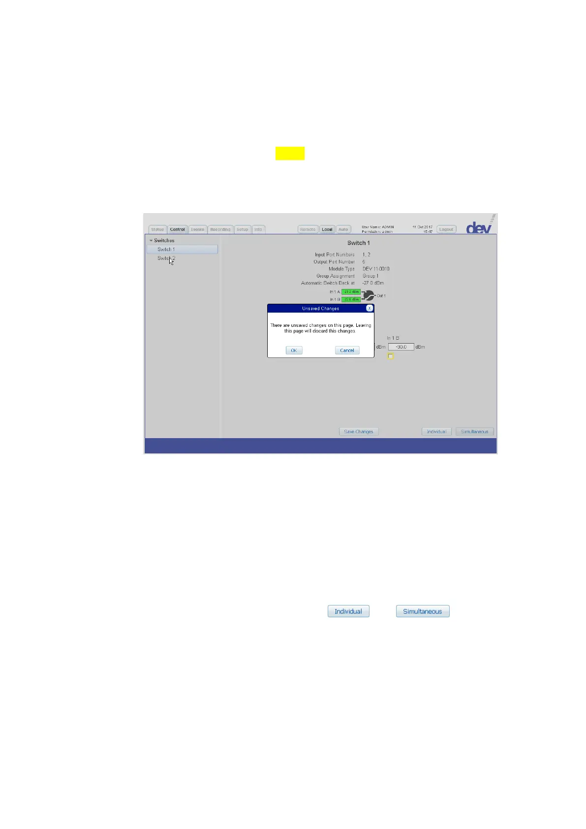 Switching and the change of settings within the Control Tab of the Web Inter-