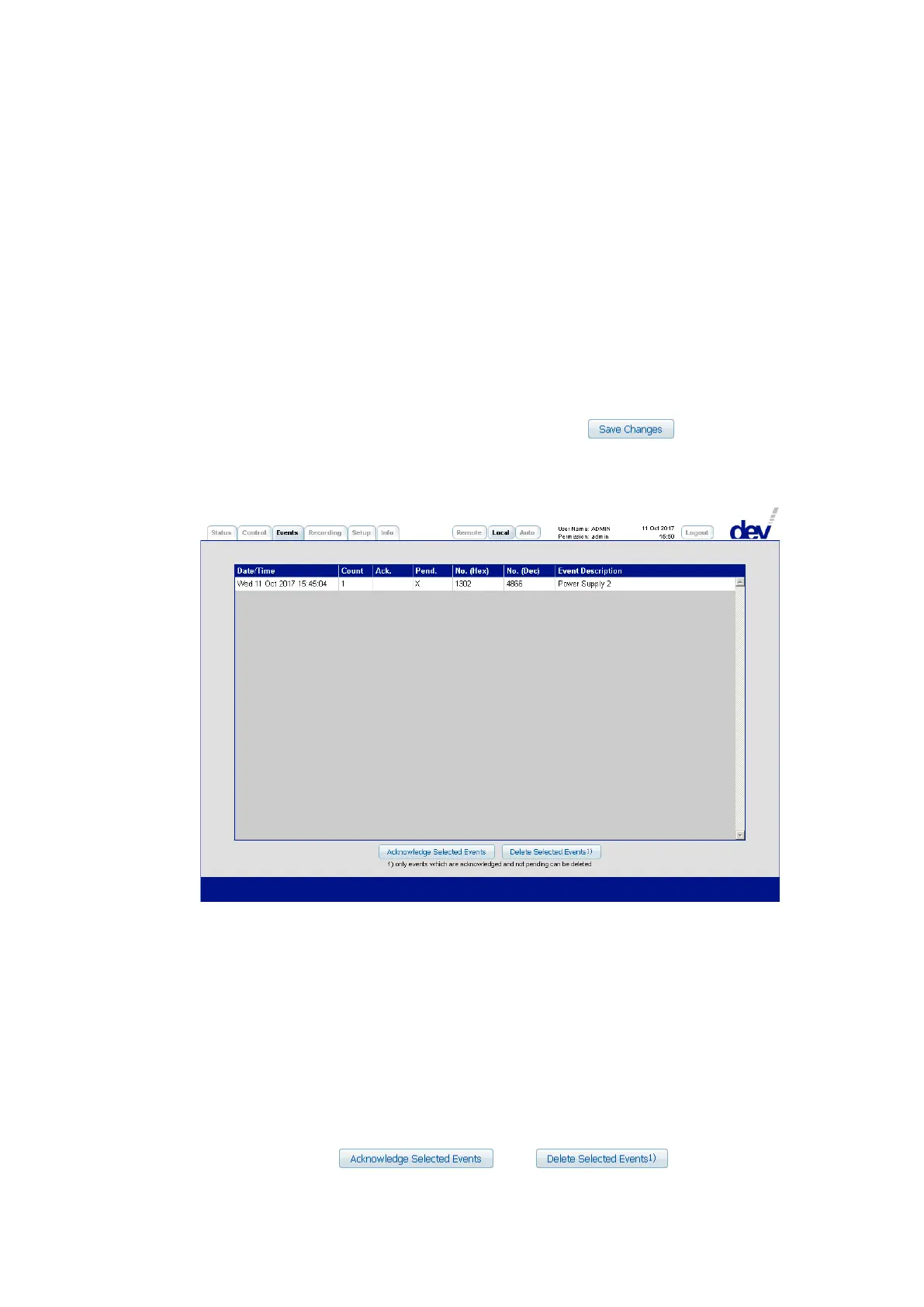 meaning not acknowledged). The fourth column shows whether that event is