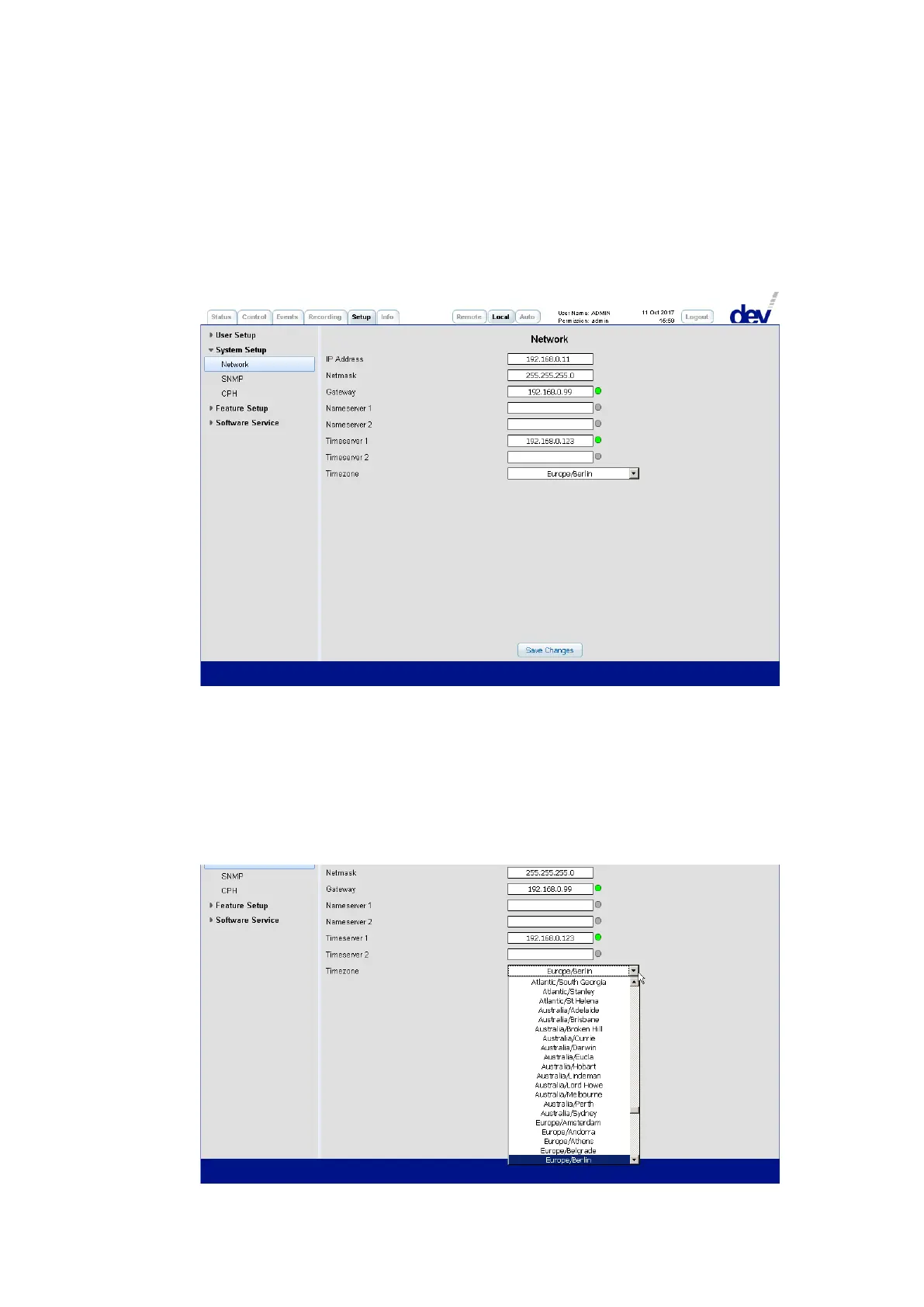 To specify the timezone select an entry from the drop down list "Timezone":