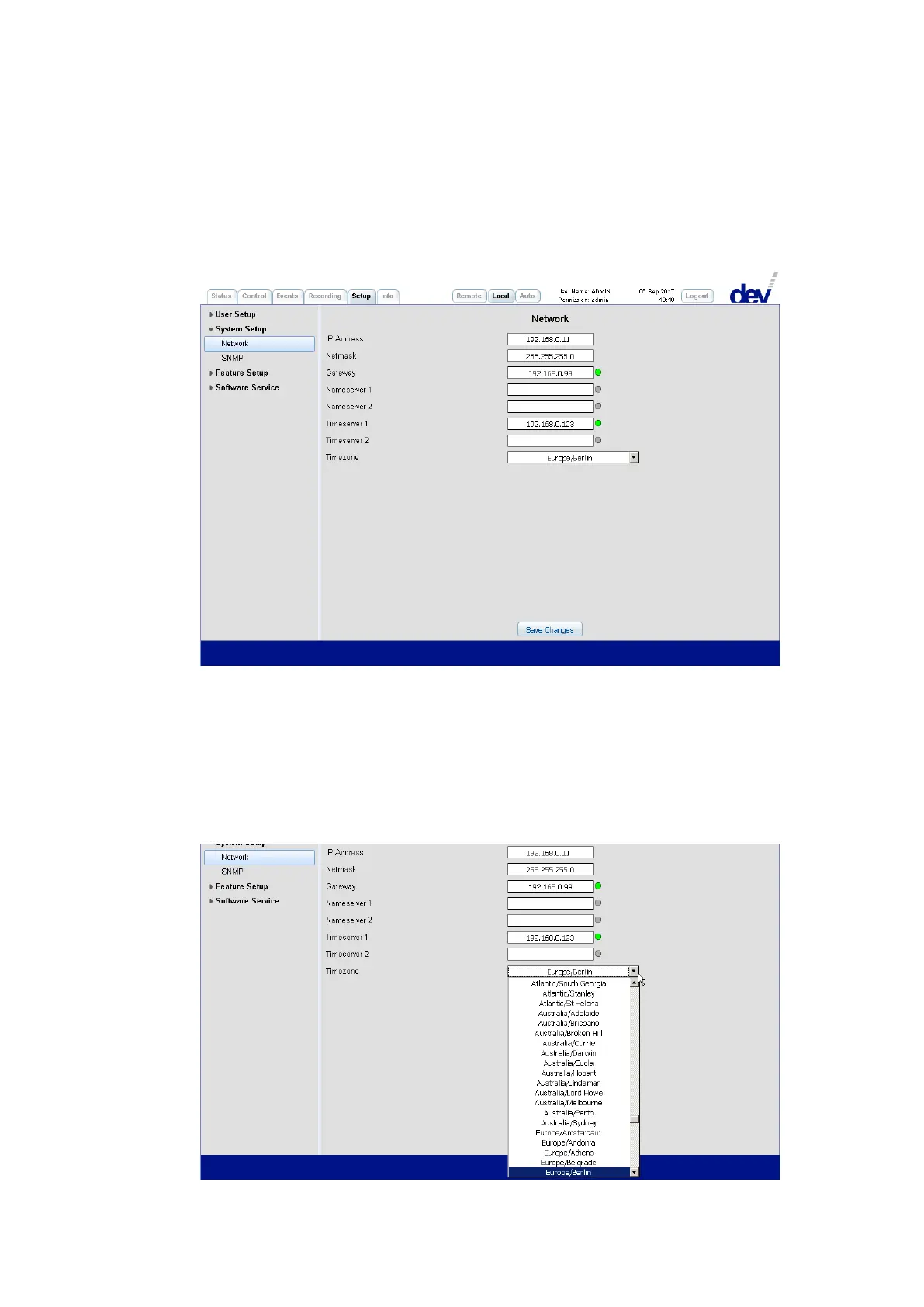 To specify the timezone select an entry from the drop down list "Timezone":