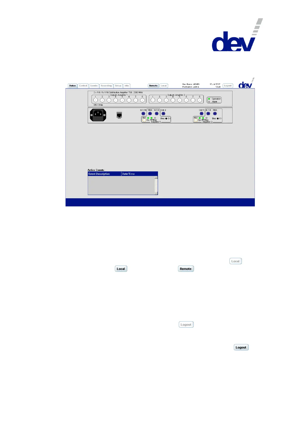 "Control", "Events", "Recording", "Setup", and "Info"). The active tab is highlighted;