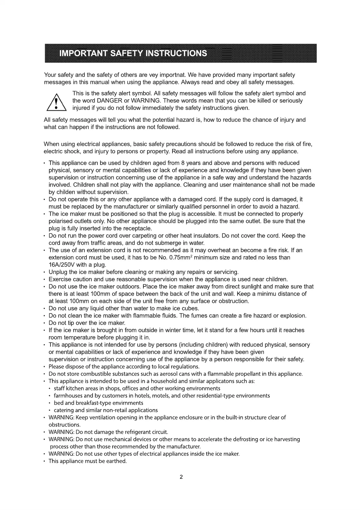 · WARNING: Do not use other types of electrical appliances inside the ice maker.