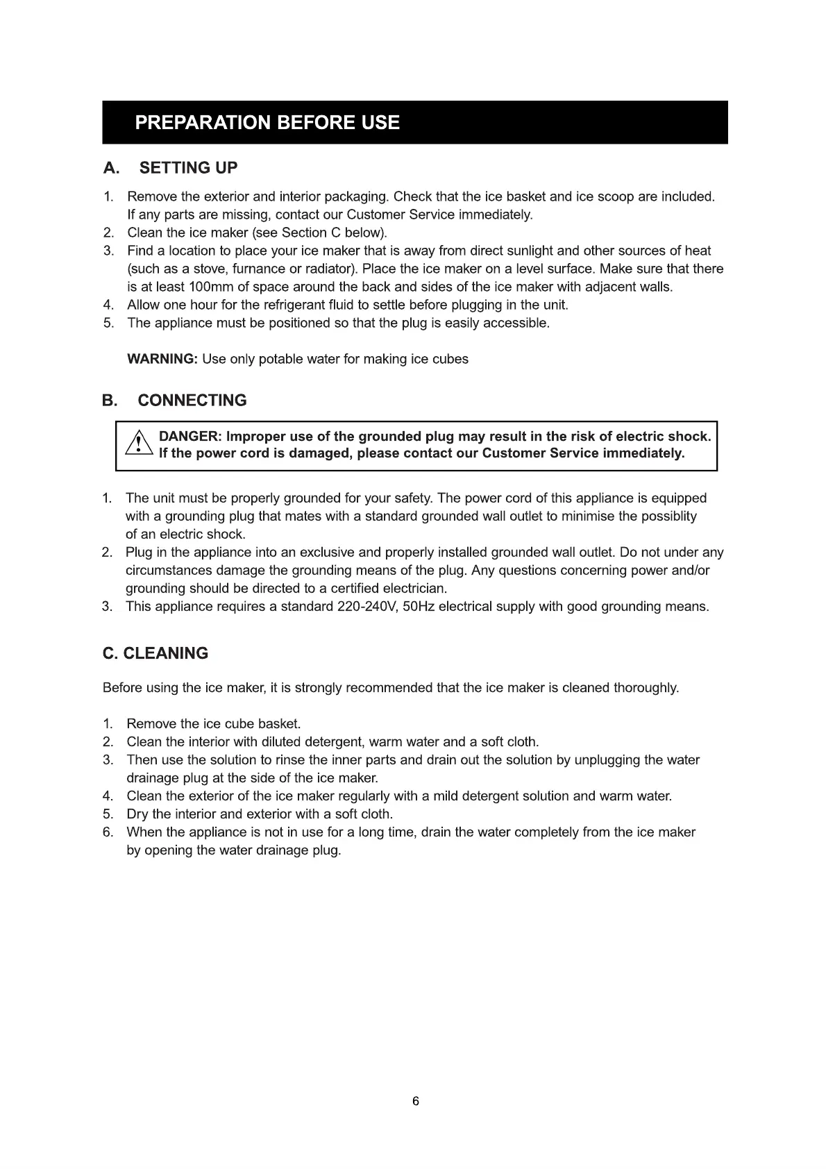 Before using the ice maker, it is strongly recommended that the ice maker is cleaned thoroughly.