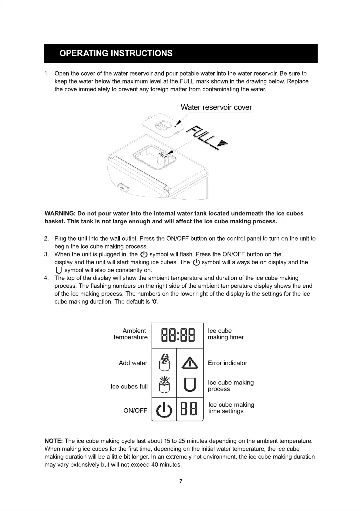 NOTE: The ice cube making cycle last about 15 to 25 minutes depending on the ambient temperature.