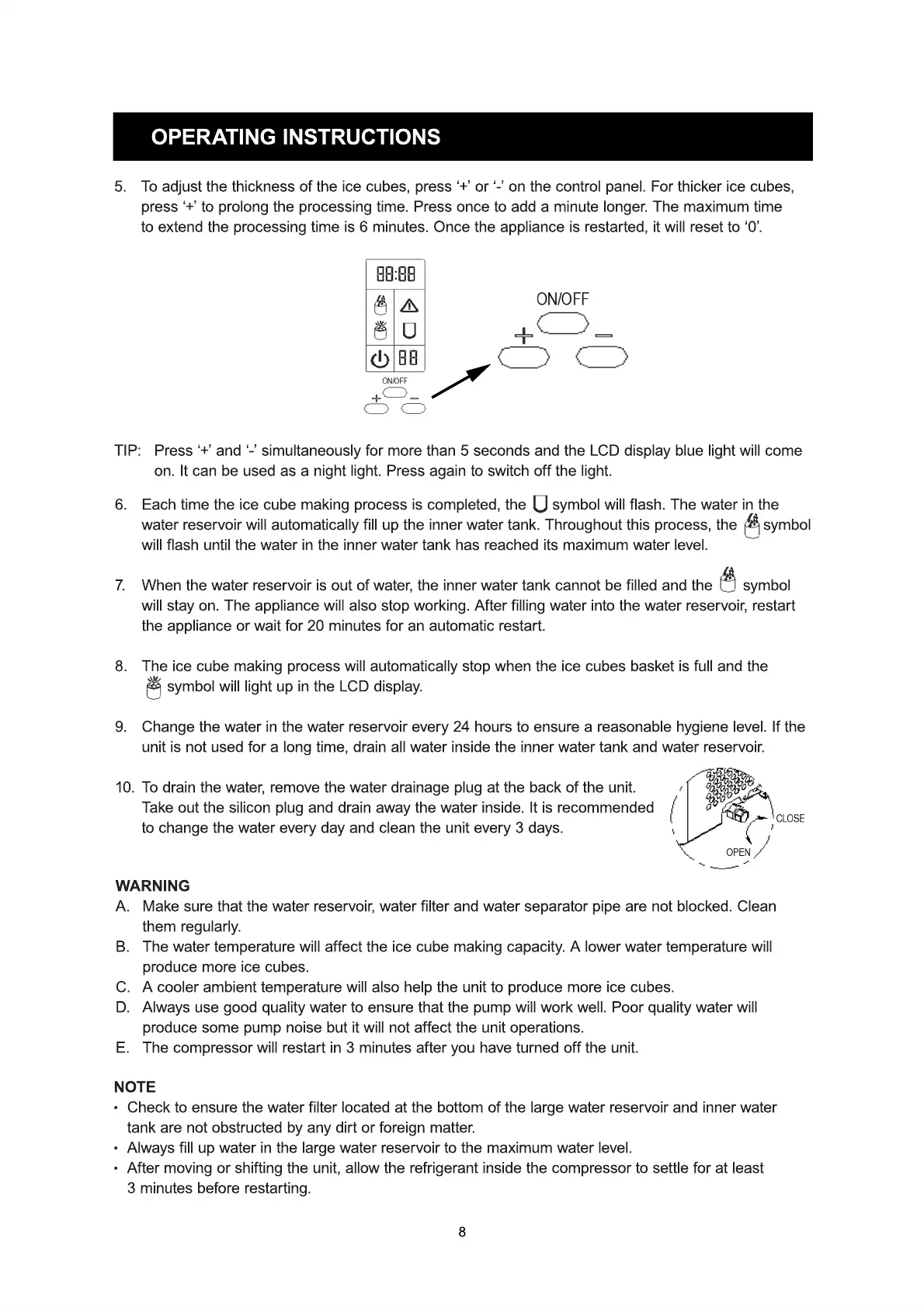5. To adjust the thickness of the ice cubes, press ‘+’ or ‘-’ on the control panel. For thicker ice cubes,