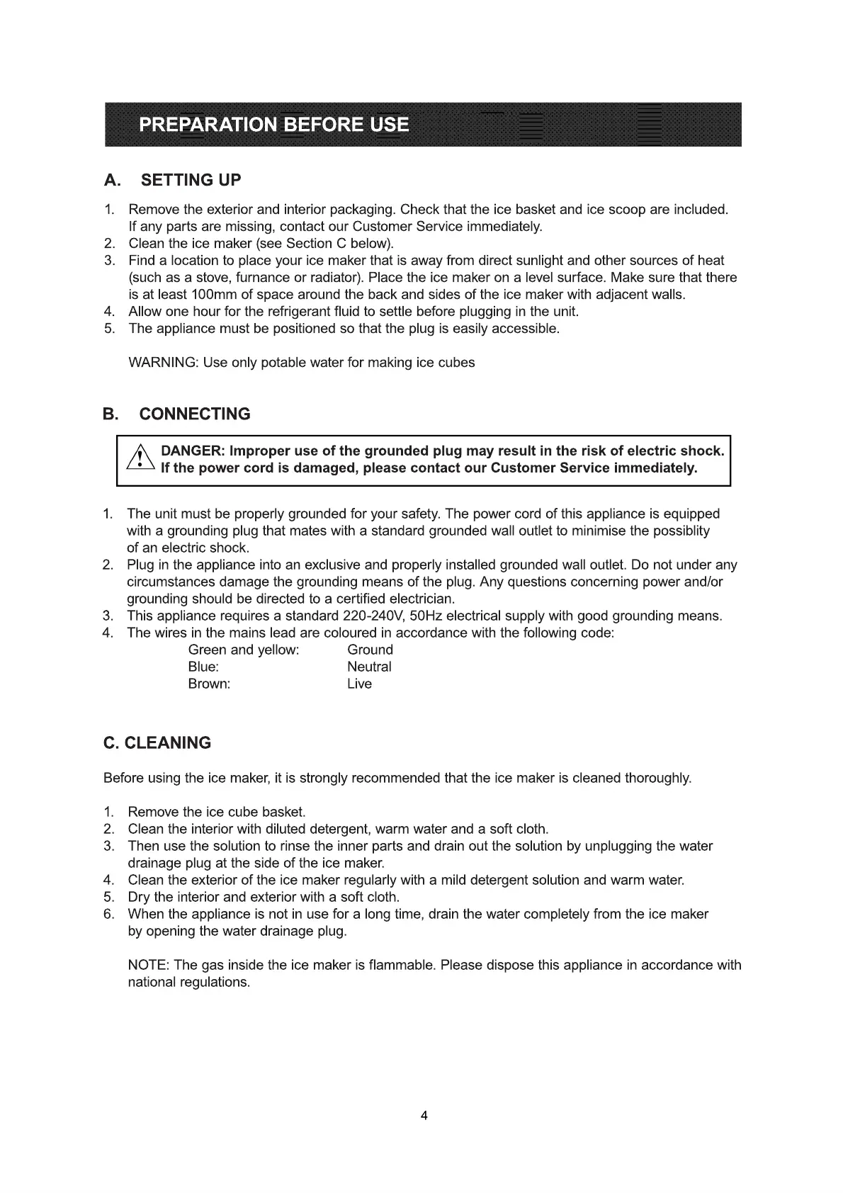 Before using the ice maker, it is strongly recommended that the ice maker is cleaned thoroughly.