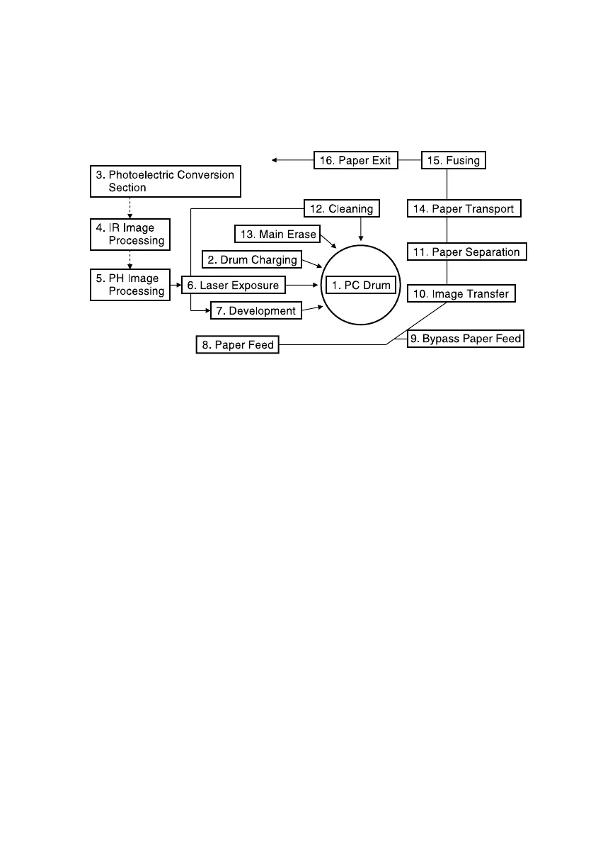 • The laser beam strikes the surface of the PC Drum, forming an electrostatic latent image.