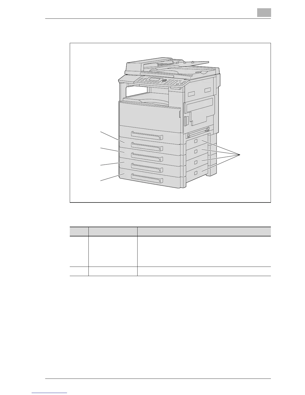 5 Right-side door Opened when clearing paper misfeeds. (See p. 8-12.)