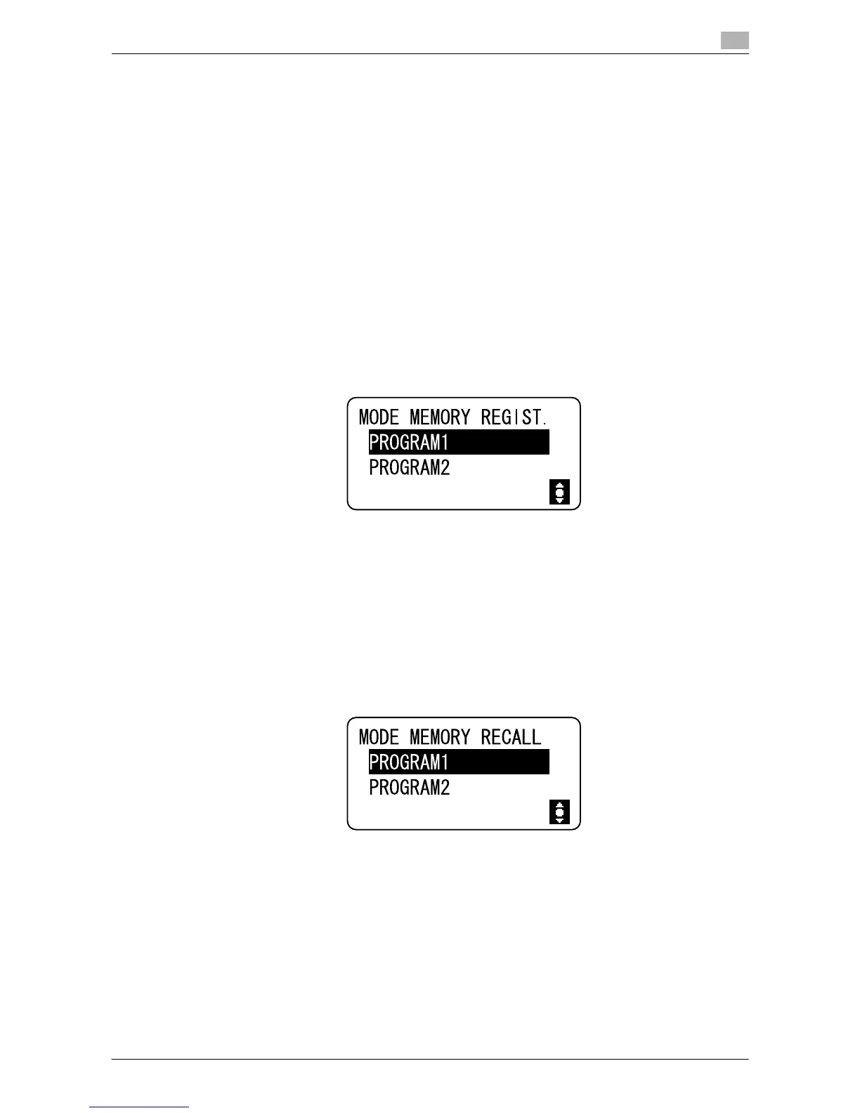 1 Press the Menu/Select key ö [COPY JOB SETTING] ö [MODE MEMORY] ö [RECALL].