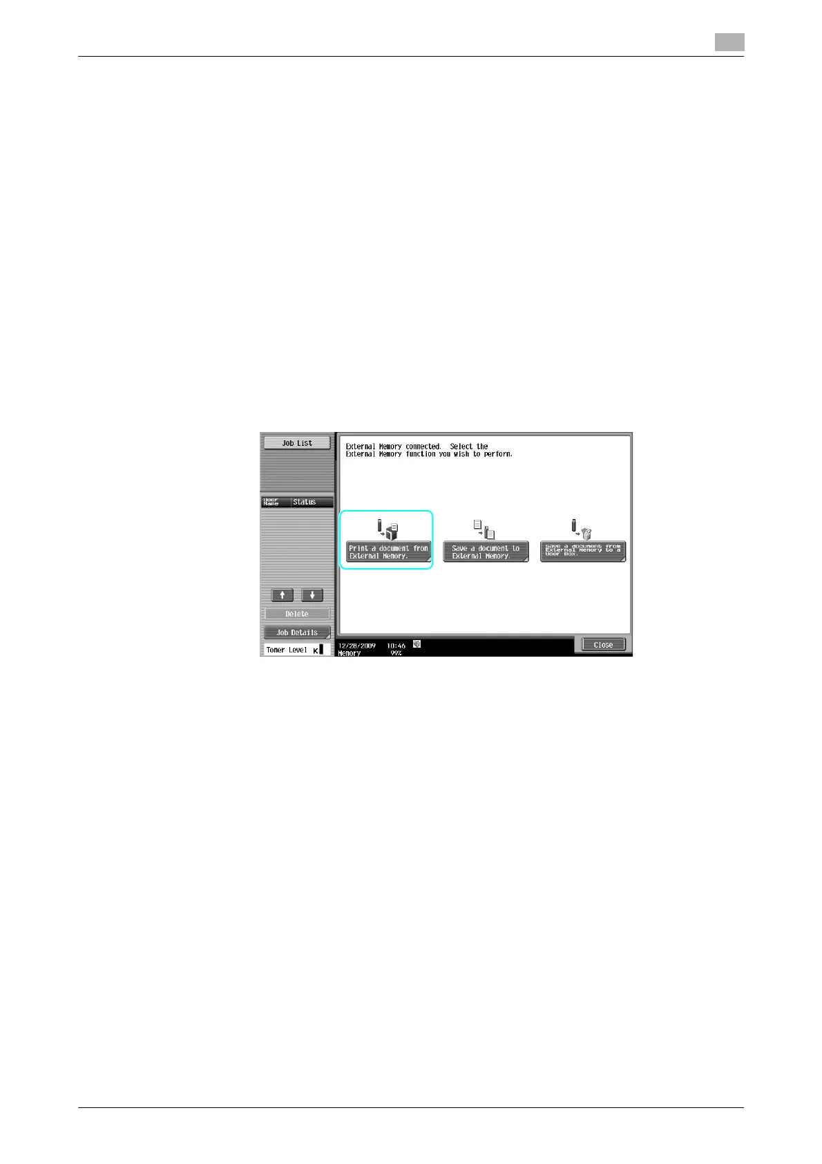 1 Connect the external memory to this machine, and press [Print a document from external memory.].