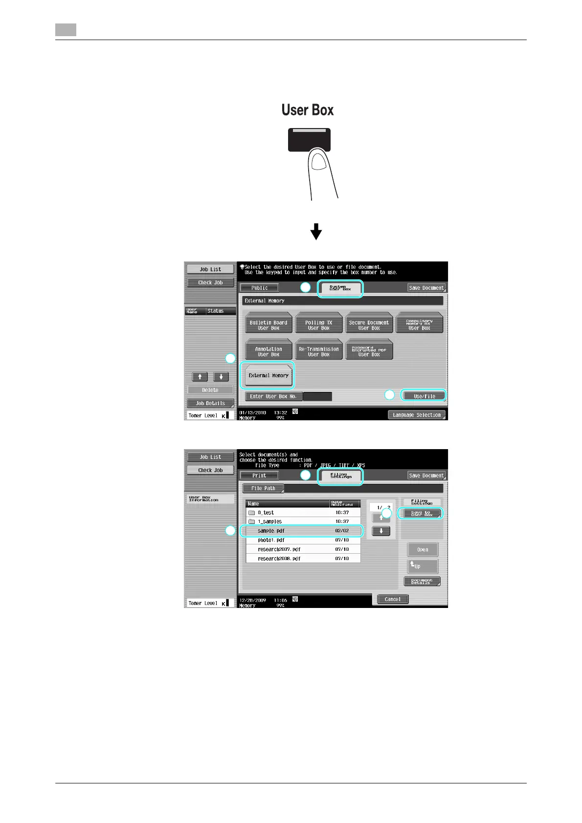 % If an external memory is already connected, press [Use/File] on the screen for User Box function.