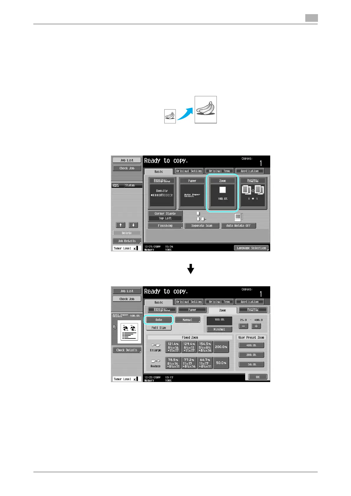 Copies can be produced with the zoom ratio automatically selected based on the size of the loaded