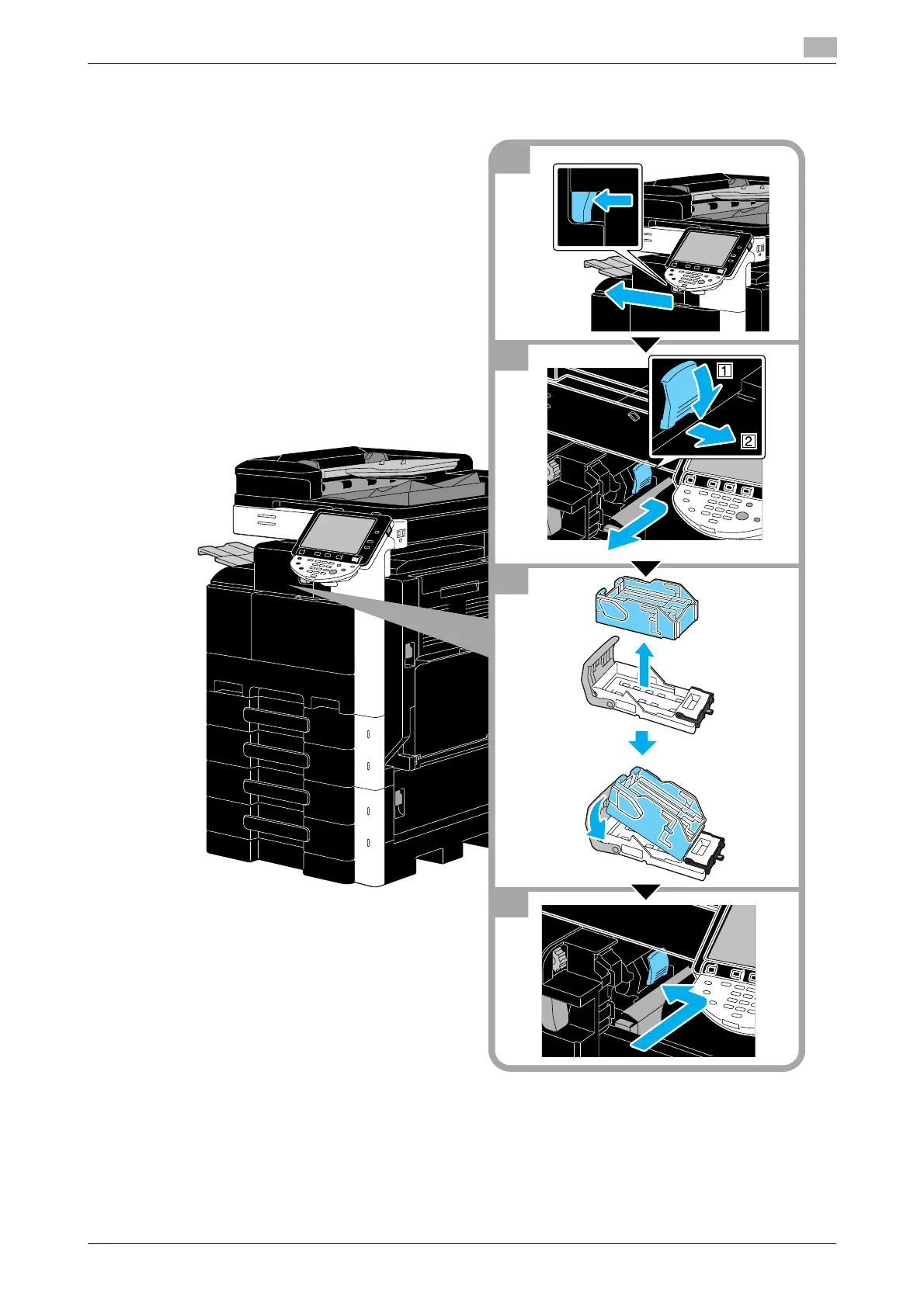The following procedure describes how to replace the staple cartridge for finisher FS-529.