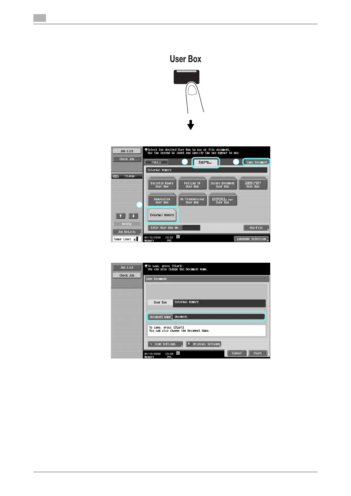 % If an external memory is already connected, press [Save Document] on the screen for User Box