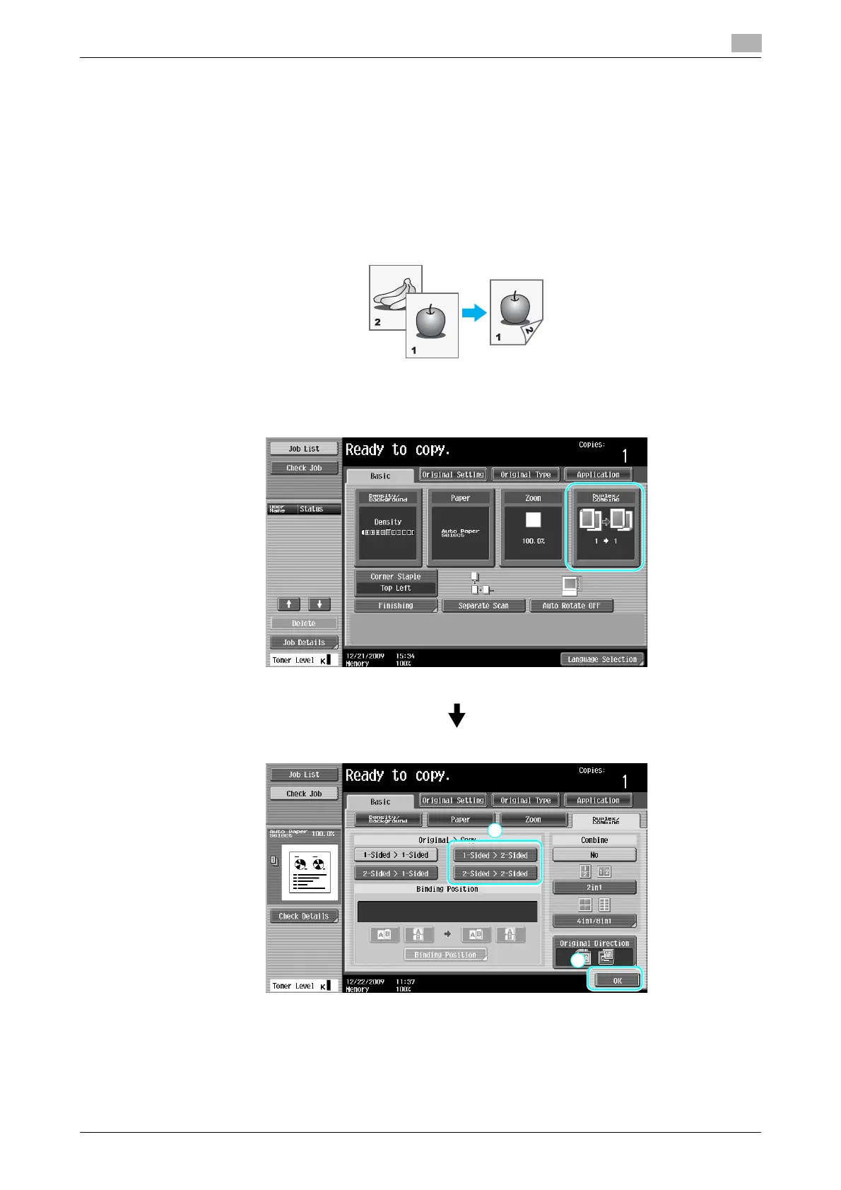 Double-sided copies (printing on both sides of the paper) and combined copies (reducing multiple pages and