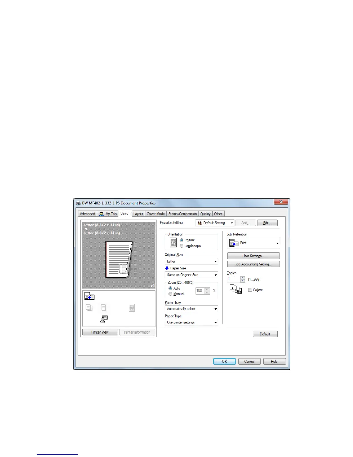 Note: For details on the printing preferences settings, refer to the Help for the Driver.