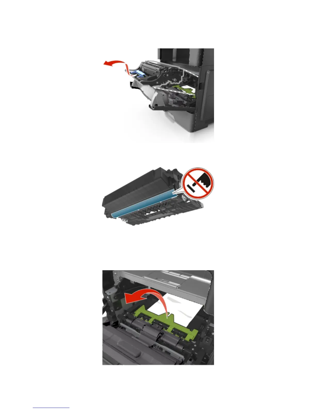 Warning—Potential Damage: Do not touch the shiny blue photoconductor drum under the imaging