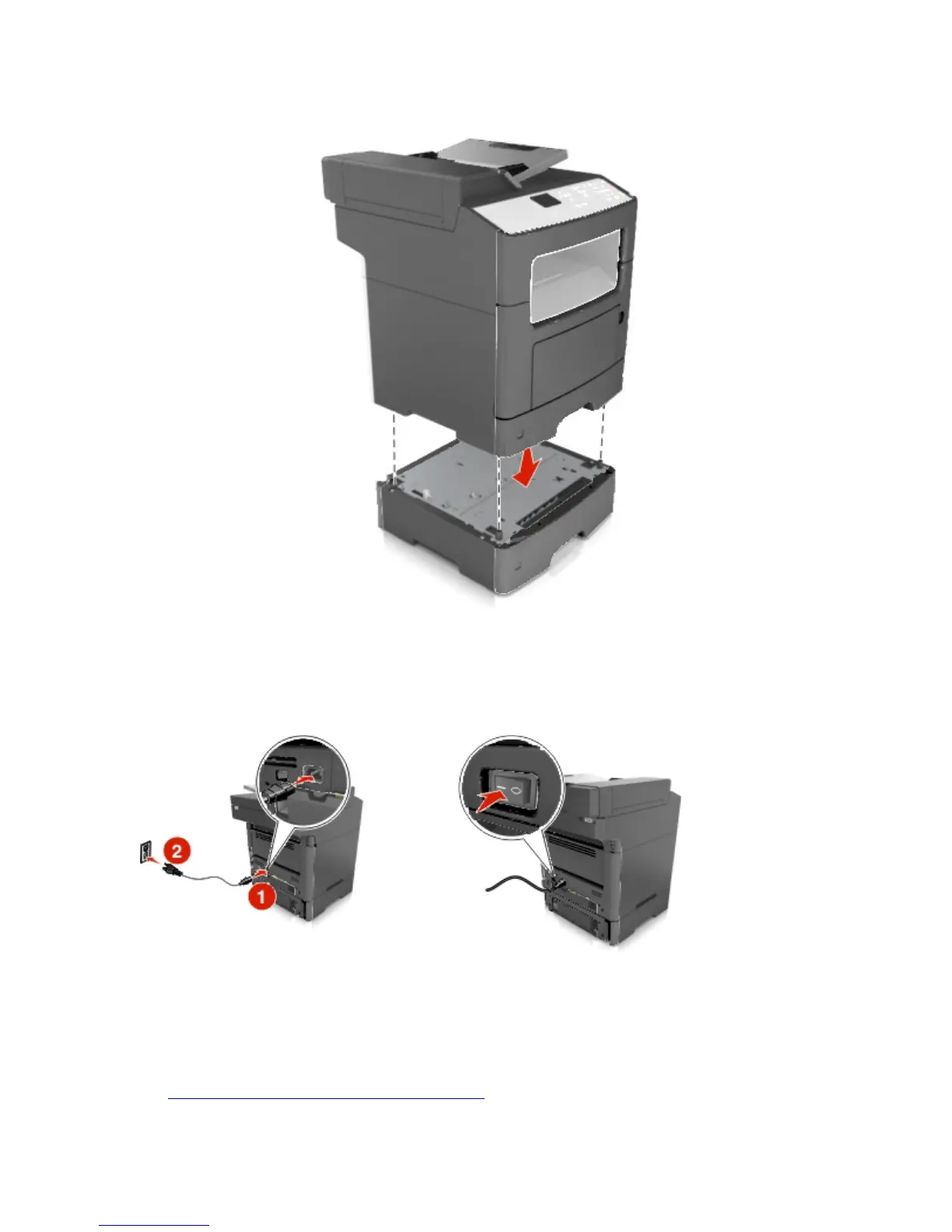 8. Connect the power cord to the printer, then to a properly grounded electrical outlet, and then turn on