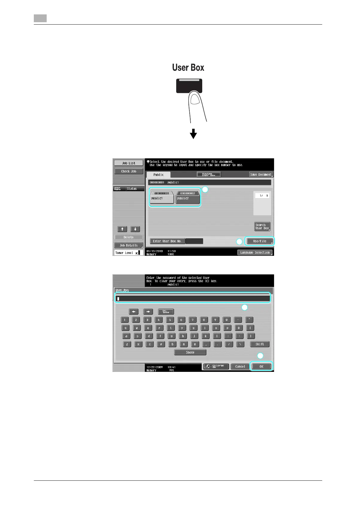 1 Select the user box containing the document to be printed, and then press [Use/File].