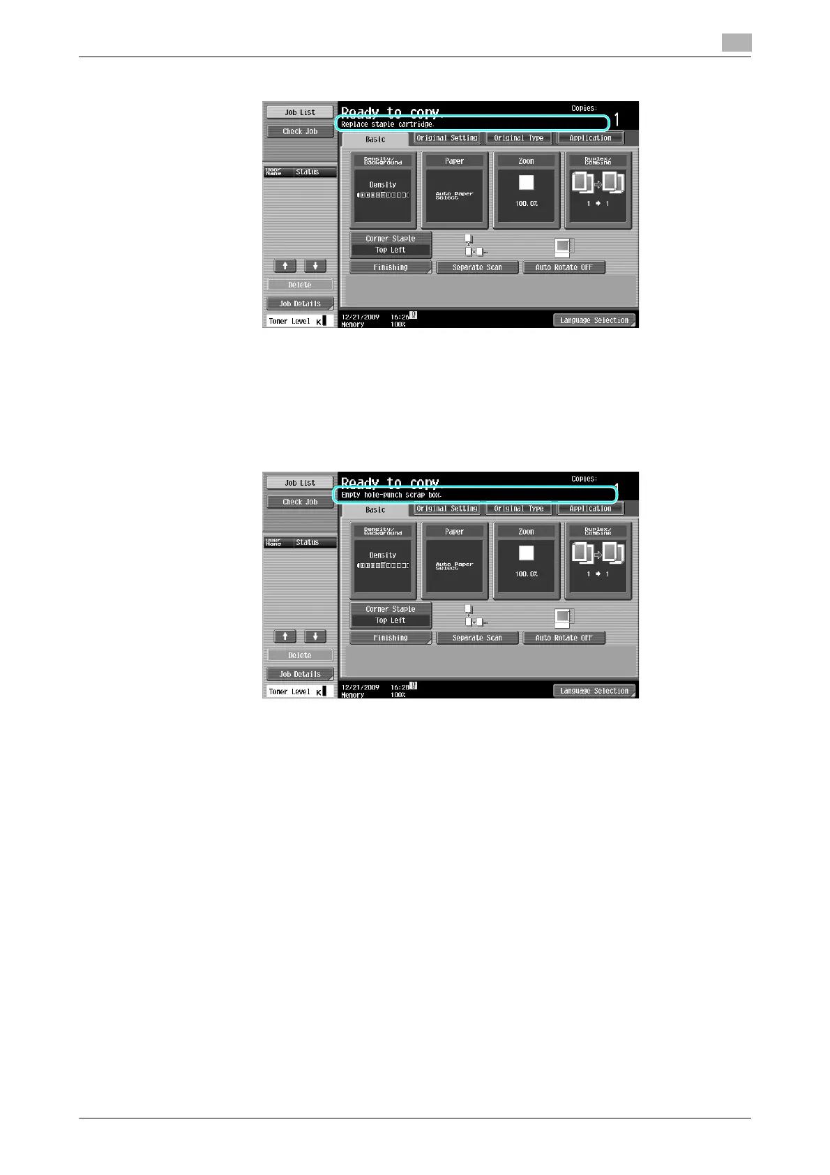 When there are no more staples in the finisher, the following message appears.