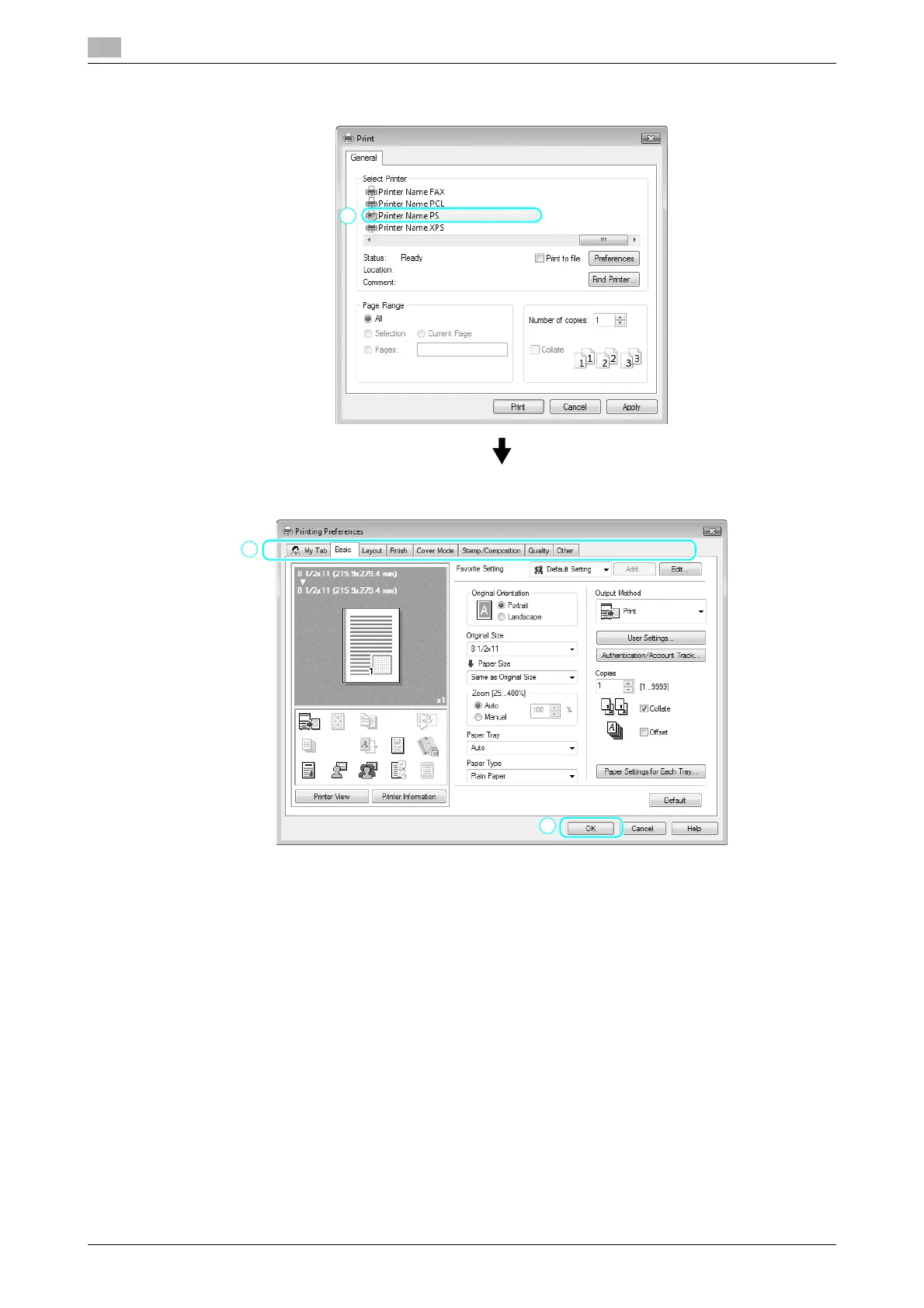 % If necessary, display the printer driver settings dialog box, and then specify the printing settings,
