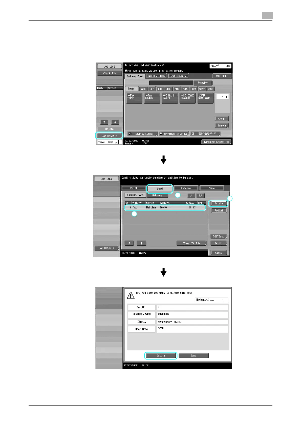 To stop the transmission after the [Start] key was pressed, press [Job List], then [Job Details], and then delete