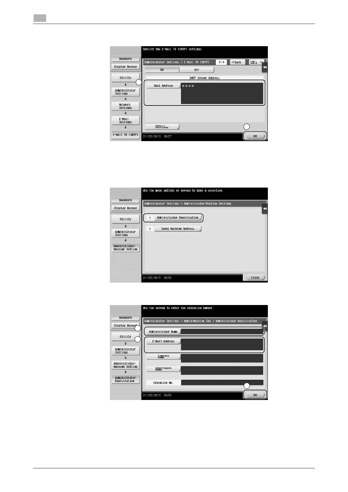 1 Tap [Utility], and select [Administrator Settings] - [Administrator/Machine Settings] - [Administrator Reg-