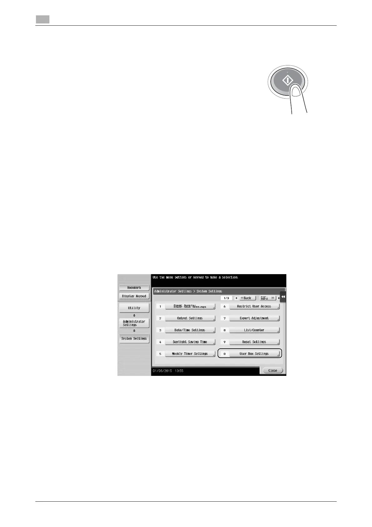 1 Tap [Utility], and select [Administrator Settings] - [System Settings] - [User Box Settings].