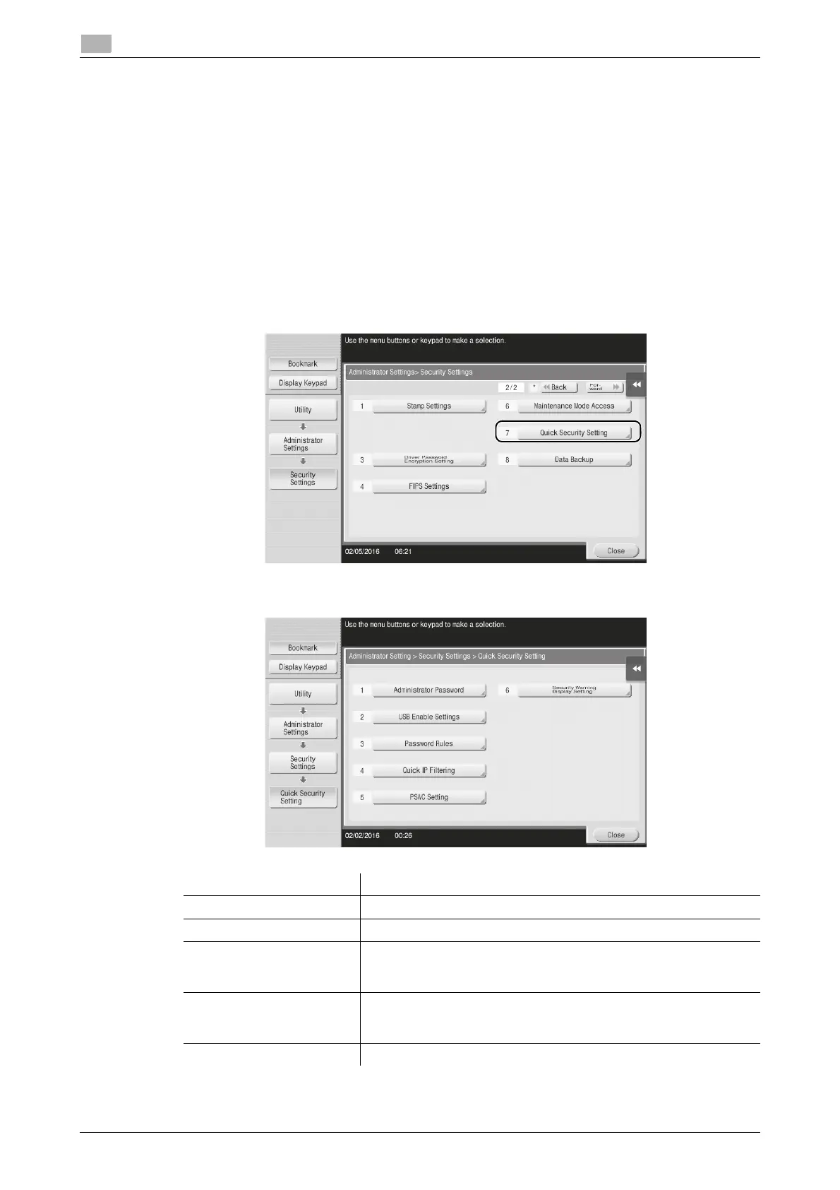 [Quick Security] allows you to configure the settings for enhancing the security level of this machine. In order