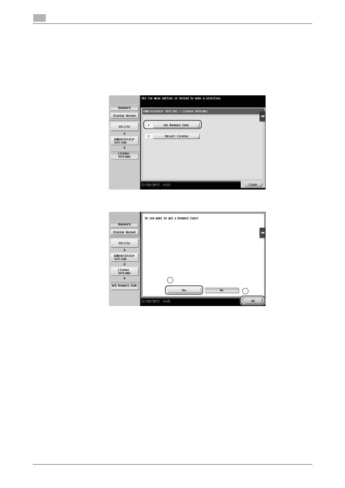 1 Tap [Utility], and select [Administrator Settings] - [Forward] - [License Settings] - [Get Request Code].