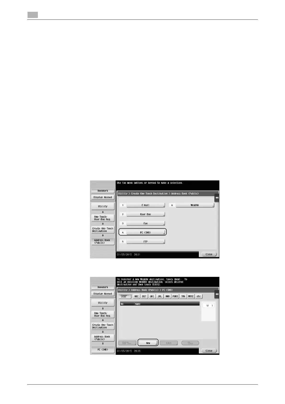 1 Tap [Utility], and select [One-Touch/ User Box Reg.] - [Create One-Touch Destination] - [Address Book