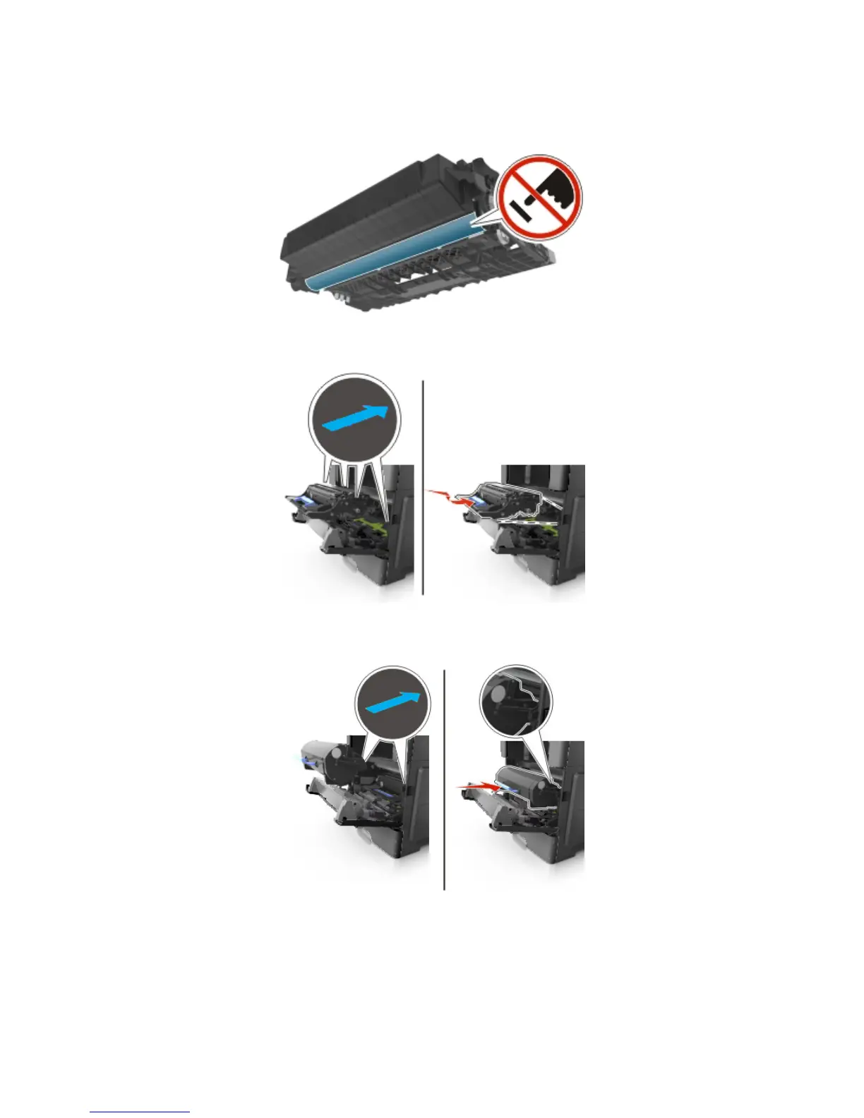 Warning—Potential Damage: Do not touch the photoconductor drum. Doing so may affect the print
