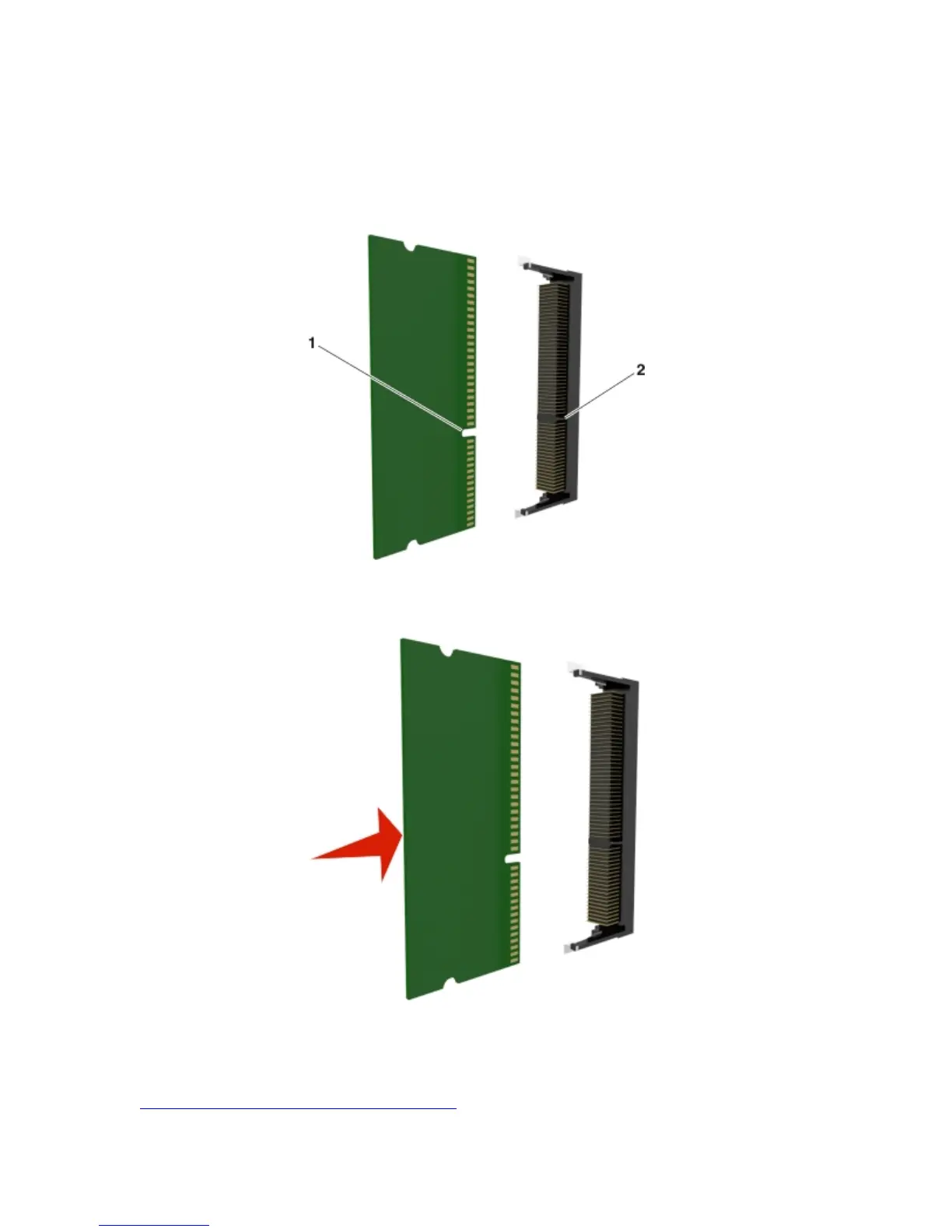 3. Align the notch (1) on the memory card with the ridge (2) on the connector.