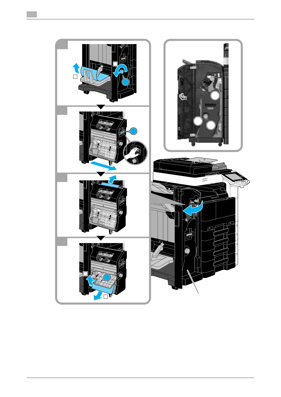 The location of the paper jam in the finisher differs depending on the selected Finishing settings.