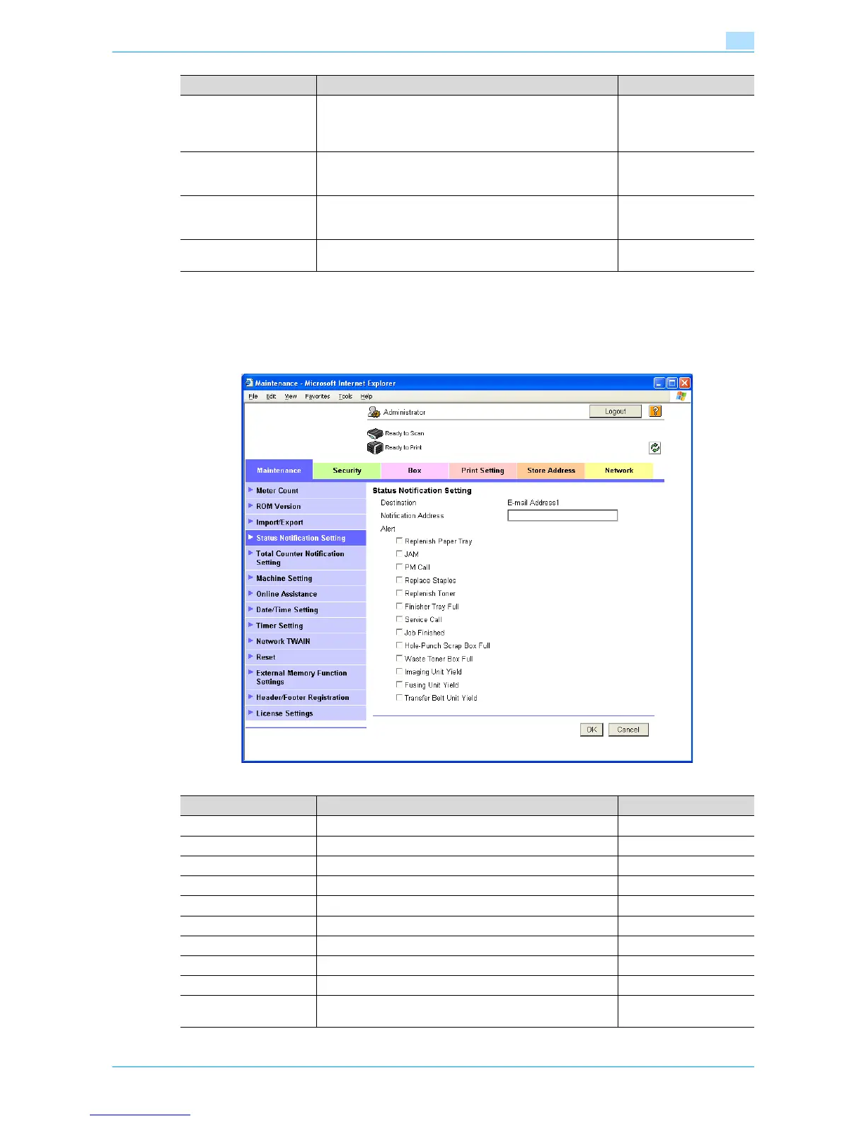 In Administrator mode of Web Connection, select the Maintenance tab - "Status Notification Setting" - "E-