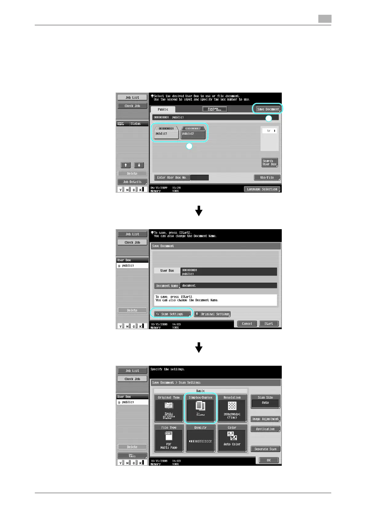 When saving data in a user box from User Box mode, press [Scan Settings] to change the settings for