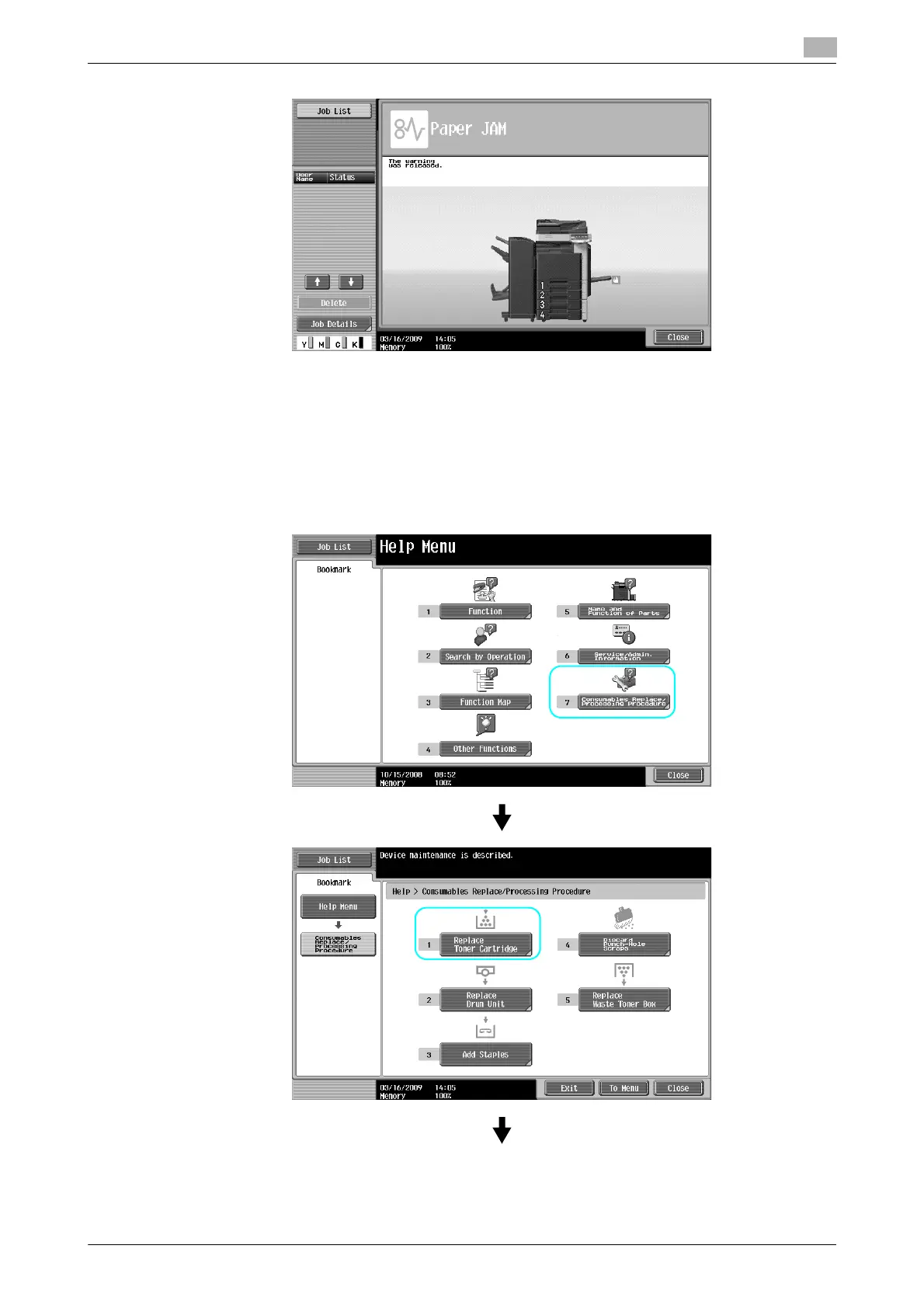 For details on how to clear paper jams or staple jams, refer to page 1-41 of this manual.