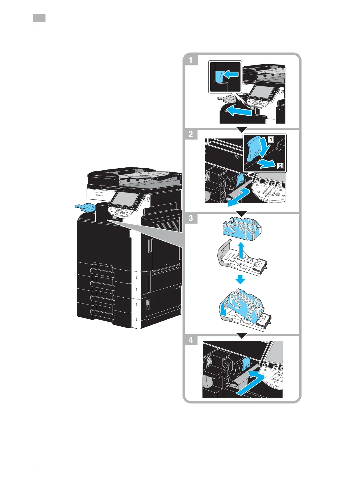 The following procedure describes how to replace the staple cartridge for finisher FS-529.