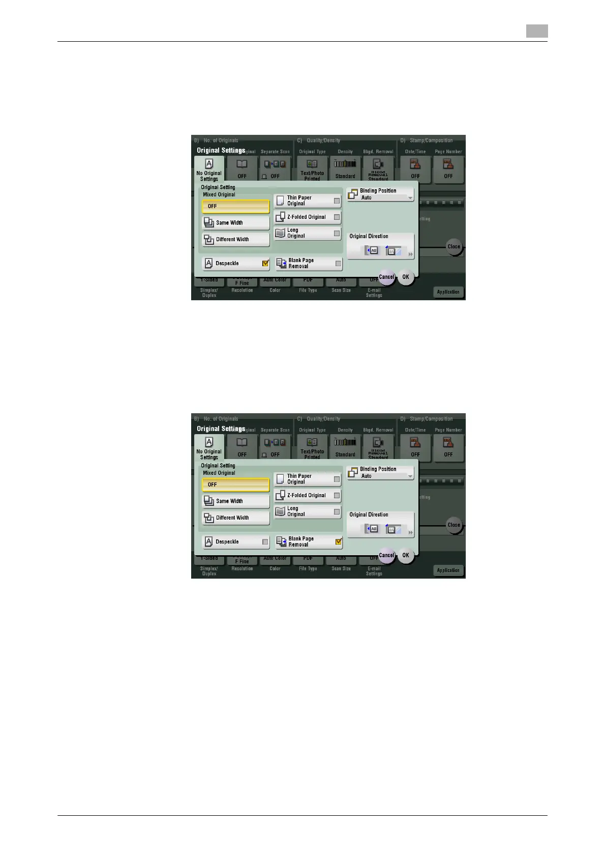 To display: [Scan/Fax] - [Application] - [No. of Originals] - [Original Settings] - [Blank Page Removal]