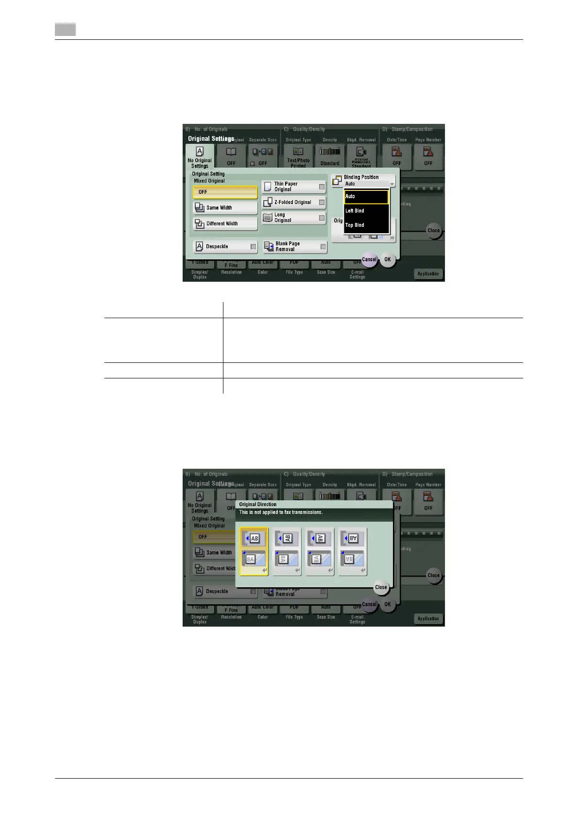 When scanning a 2-sided original, select the original binding position to prevent the binding positions being