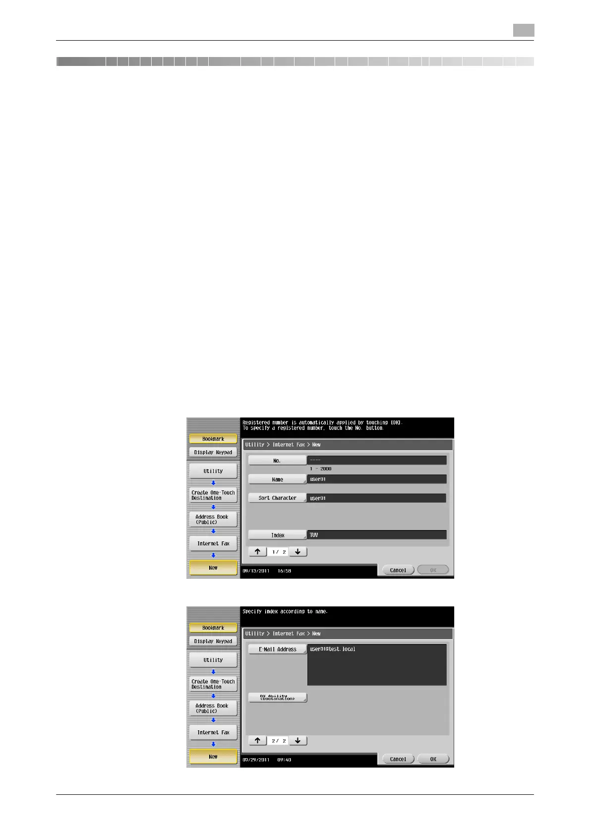 1 Tap [Utility] - [One-Touch/User Box Registration] - [Create One-Touch Destination] - [Address Book