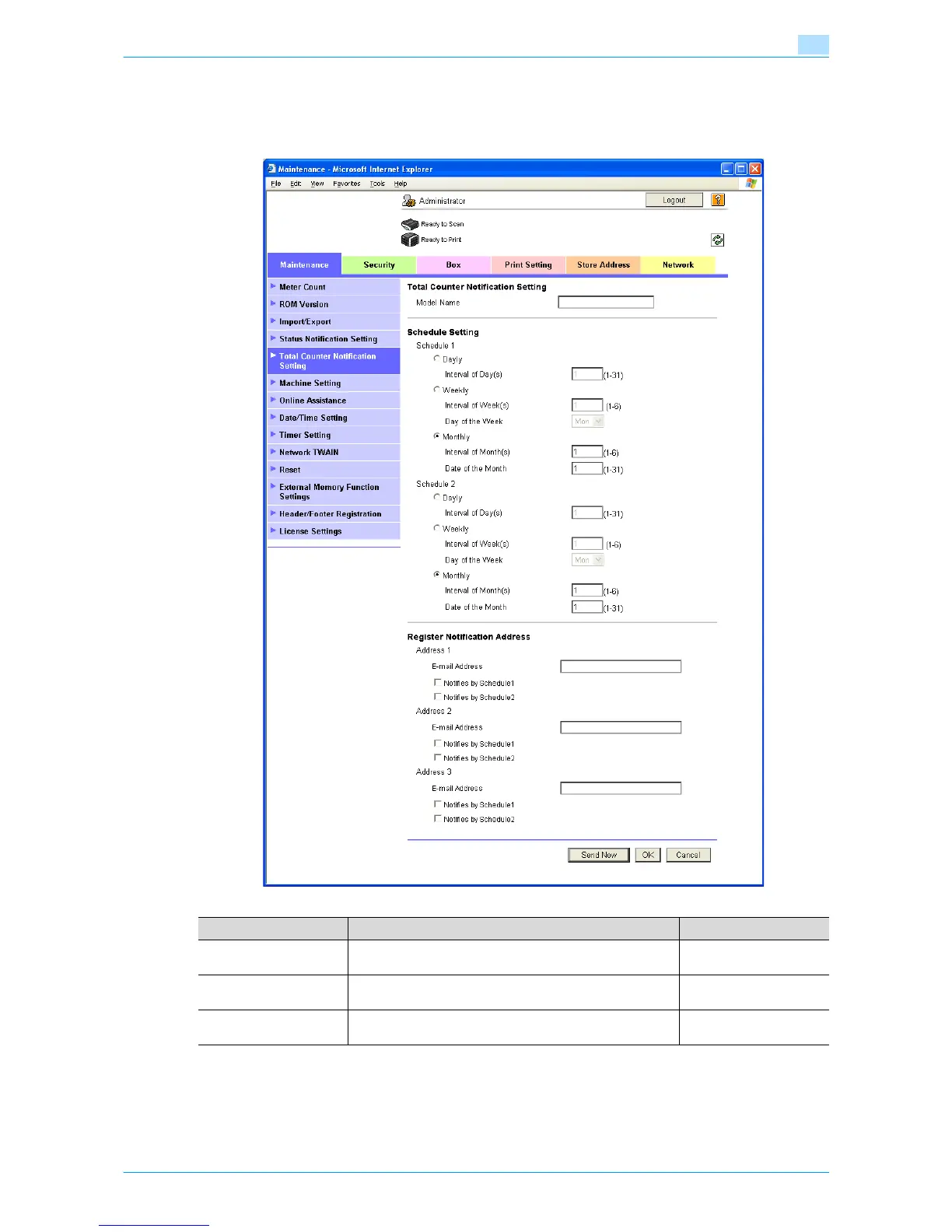 In Administrator mode of Web Connection, select the Maintenance tab - "Total Counter Notification Setting".