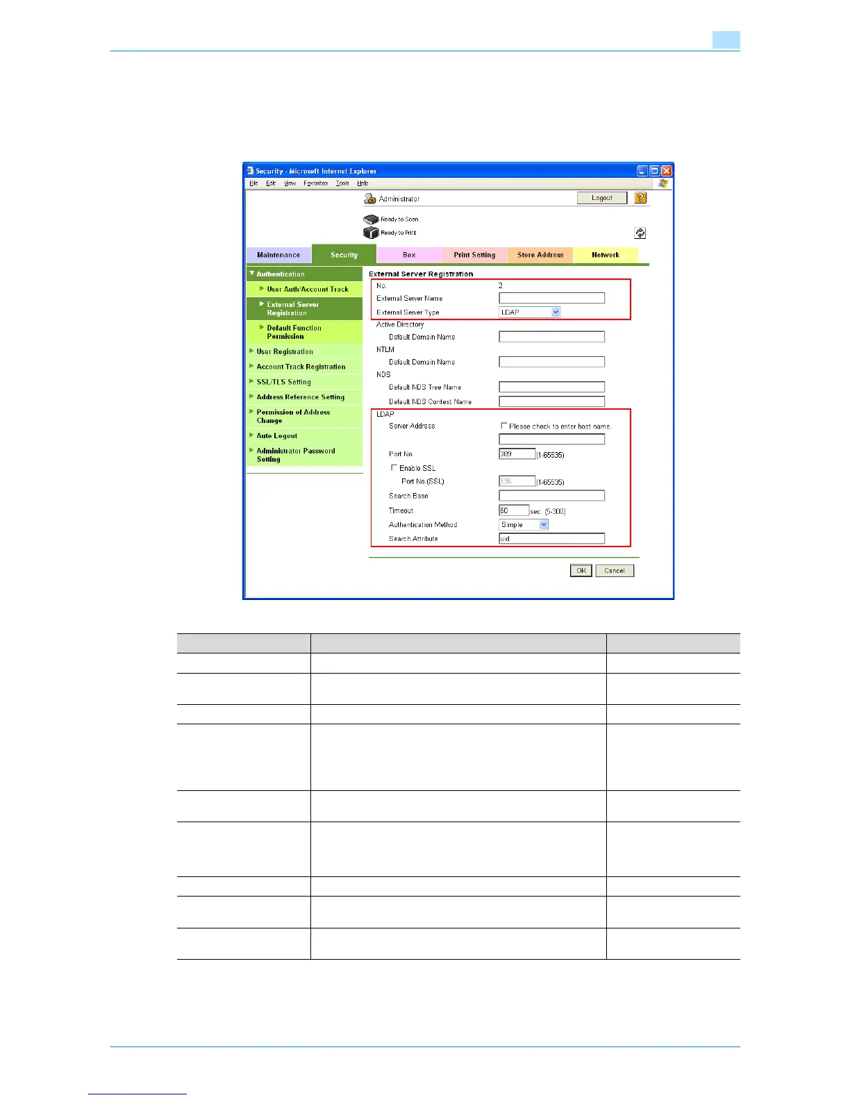 In Administrator mode of Web Connection, select the Security tab - "Authentication" - "External Server