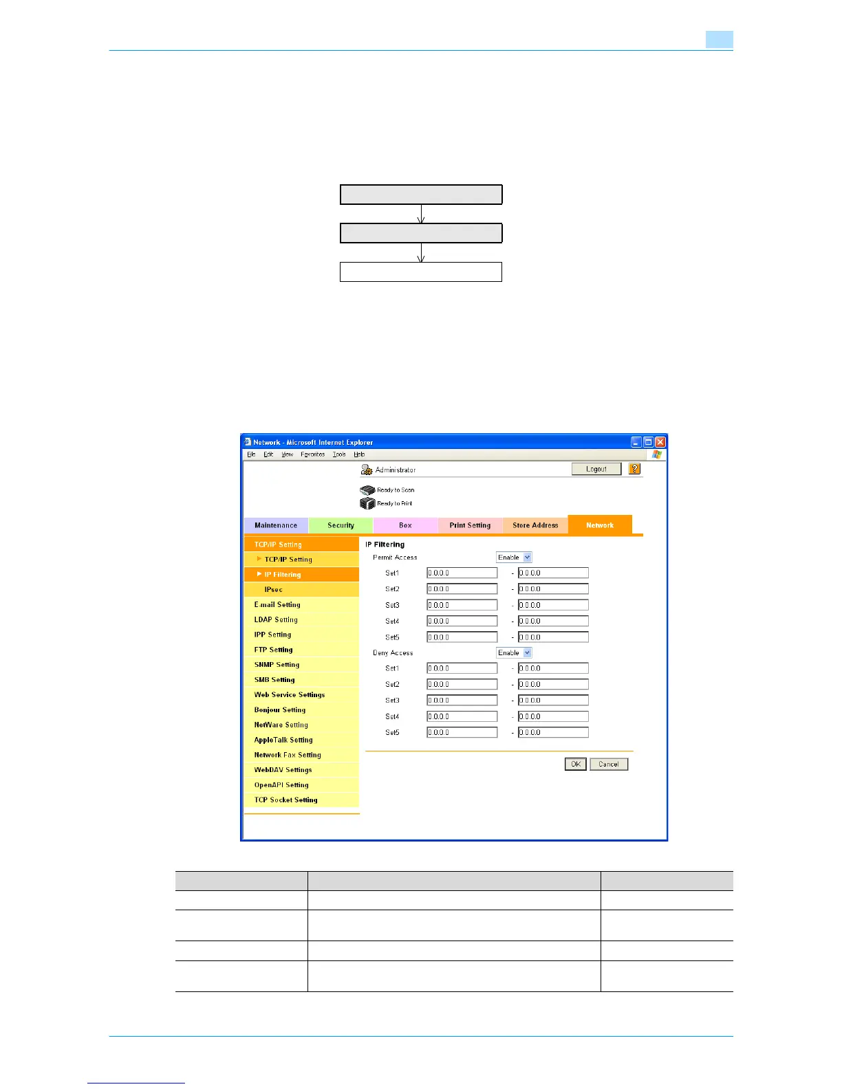 In Administrator mode of Web Connection, select the Network tab - "TCP/IP Setting" - "IP Filtering".