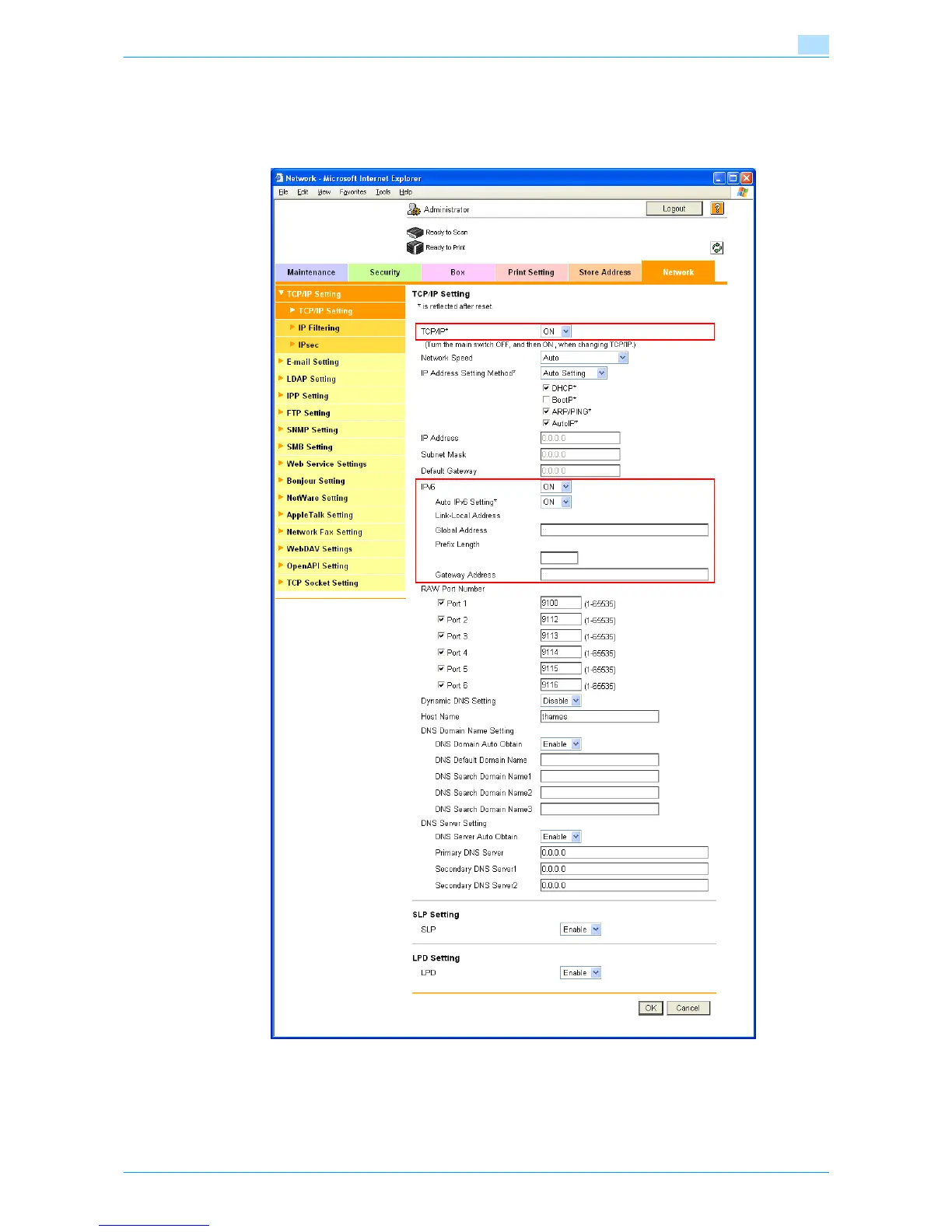 In Administrator mode of Web Connection, select the Network tab - "TCP/IP Setting" - "TCP/IP Setting".