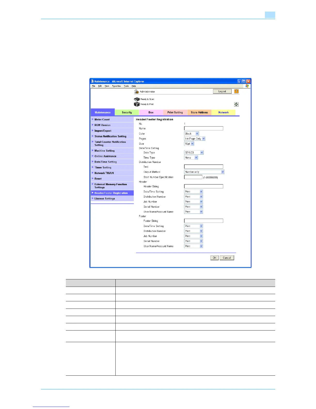 In Administrator mode of Web Connection, select the Maintenance tab - "Header/Footer Registration" -