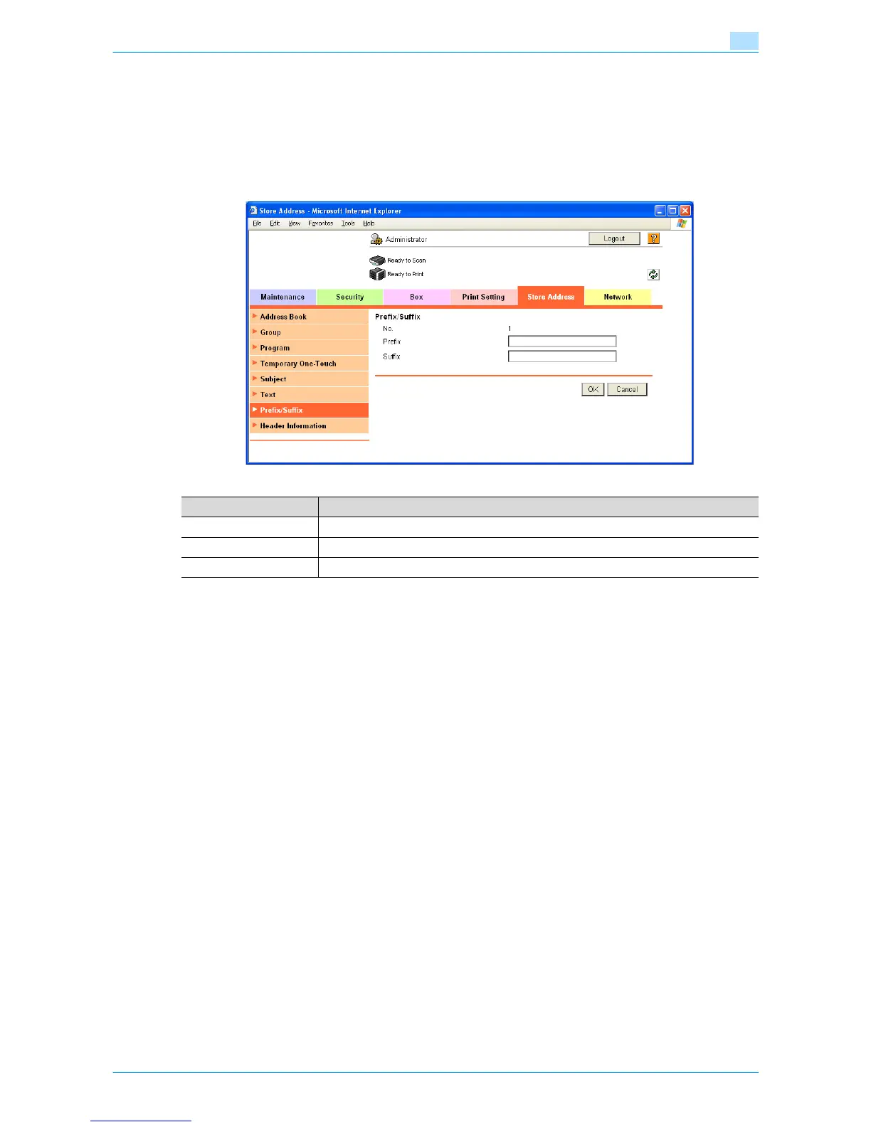 In Administrator mode of Web Connection, select the Store Address tab - "Prefix/Suffix" - [Edit].