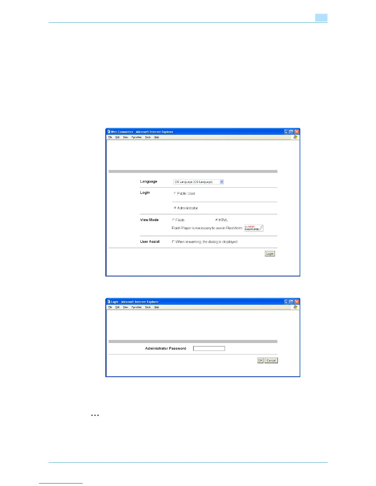 To specify settings for this machine with Web Connection, Administrator mode must be logged in. The