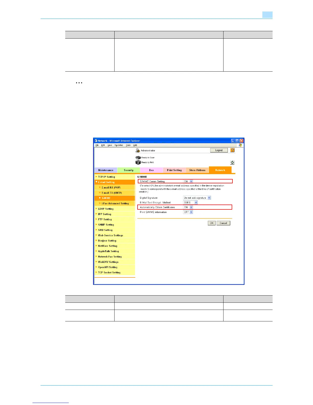 In Administrator mode of Web Connection, select the Network tab - "E-mail Setting" - "S/MIME".