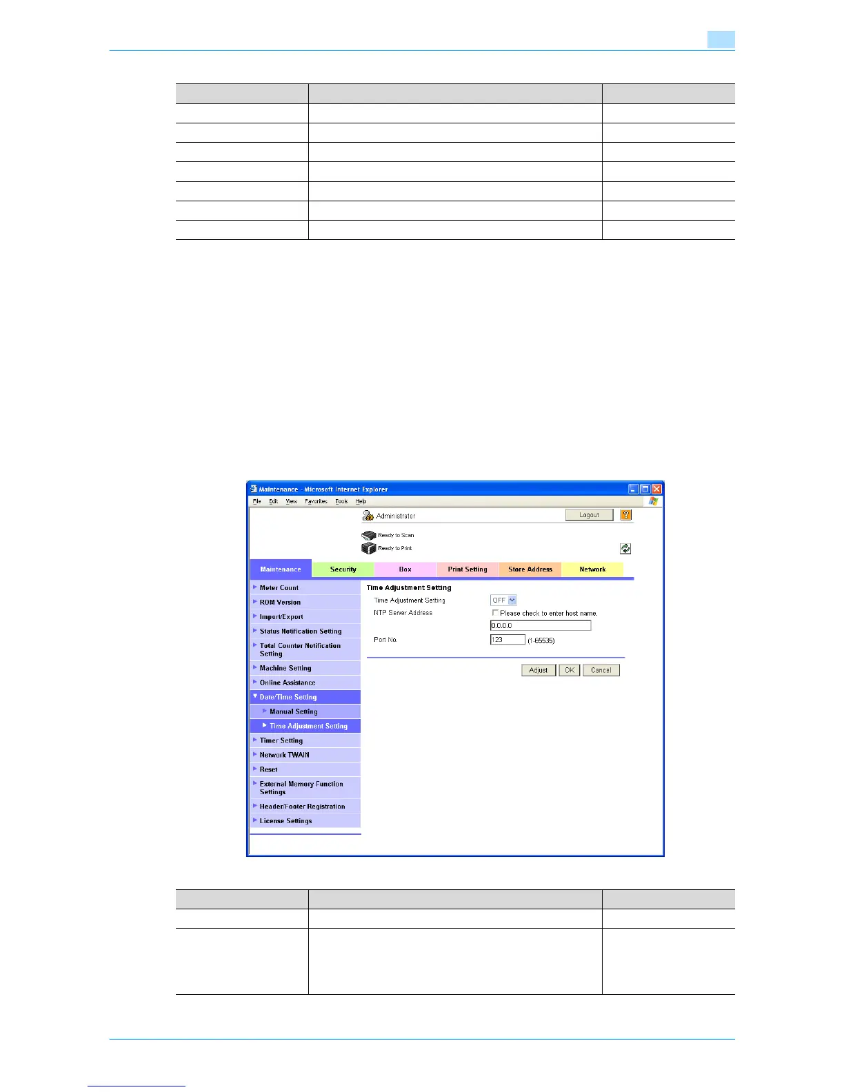 In Administrator mode of Web Connection, select the Maintenance tab - "Date/Time Setting" - "Time